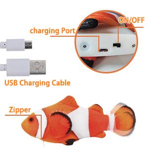 - Unzip the fish belly and then plug one end of the charging cable into the mechanism, then plug the other end into a mobile phone adapter or a portable charger.